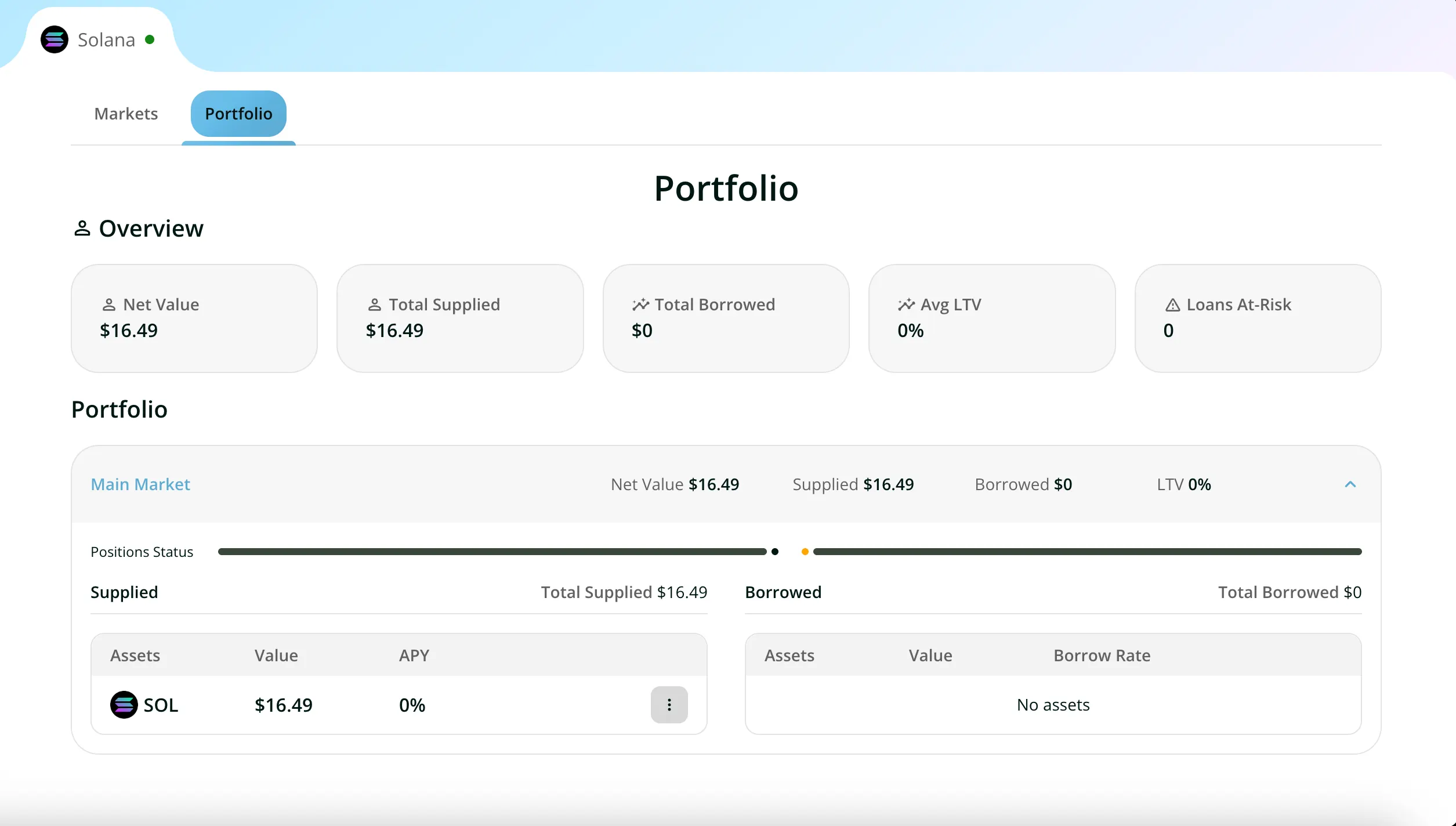 The Portfolio page provides an overview of your positions across all markets in the protocol. It serves as your main dashboard to track supplied assets, borrowed assets, and overall risk in real time.